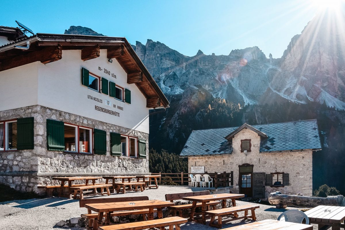 Places To Stay: Ortisei is a brilliant base for this hike — a proper alpine town with colourful streets, cosy hotels, and a direct lift to the Seceda ridgeline. You’ll find everything from family-run B&Bs to wellness hotels with saunas for easing sore legs. Rifugios like Fermeda or Firenze also give the option to stay up high, which means catching sunrise and sunset on the peaks.