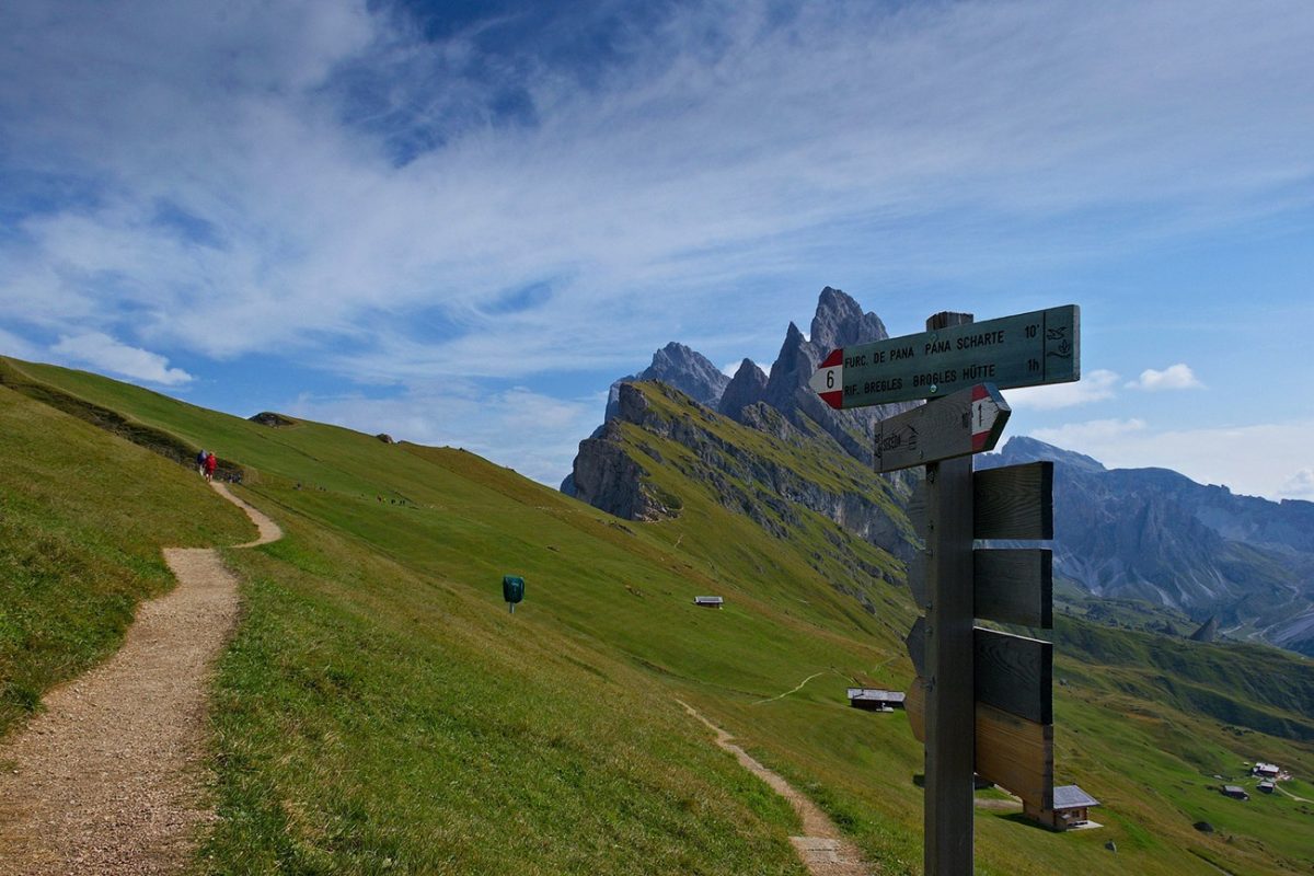 From the viewpoint, the route begins to feel more like a real hike. Following Path 1, you’ll make your way towards Pana Scharte, a gap in the ridgeline that opens out dramatic views across the Val Gardena. The path here gently rises and lowers, hugging the grassy slopes with the cliffs towering above to your left. It’s an easy section underfoot, but one of the most atmospheric, the sense of being high on the shoulder of the Dolomites really hits home.