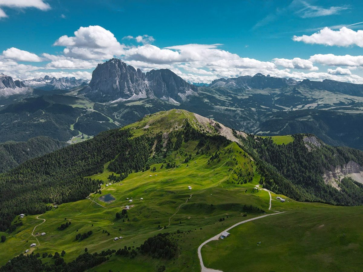 From the town of Ortisei (1,245m), you’ll take the Ortisei–Furnes gondola, then transfer onto the Furnes–Seceda cable car which whisks you up to 2,500m in minutes. At the top it’s just a short stroll to the famous Seceda viewpoint, the sharp ridgeline of the Odle–Geisler peaks is one of the Dolomites’ most iconic sights. Many people simply soak up the views and return by cable car, but this route takes things a step further: walking the long way back down into Ortisei. It’s a tough 9-mile descent, but worth it for the views, mountain huts, and variety of terrain you’ll experience on the way.