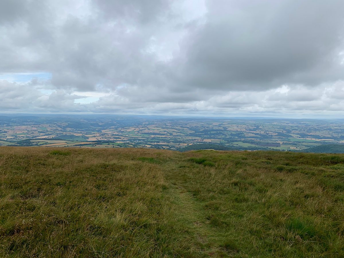 After taking in wide views across the Vale of Ewyas, the return leg passes over Pen y Gadair Fawr before descending through peaty moorland and grassy ridges back to Mynydd Du.