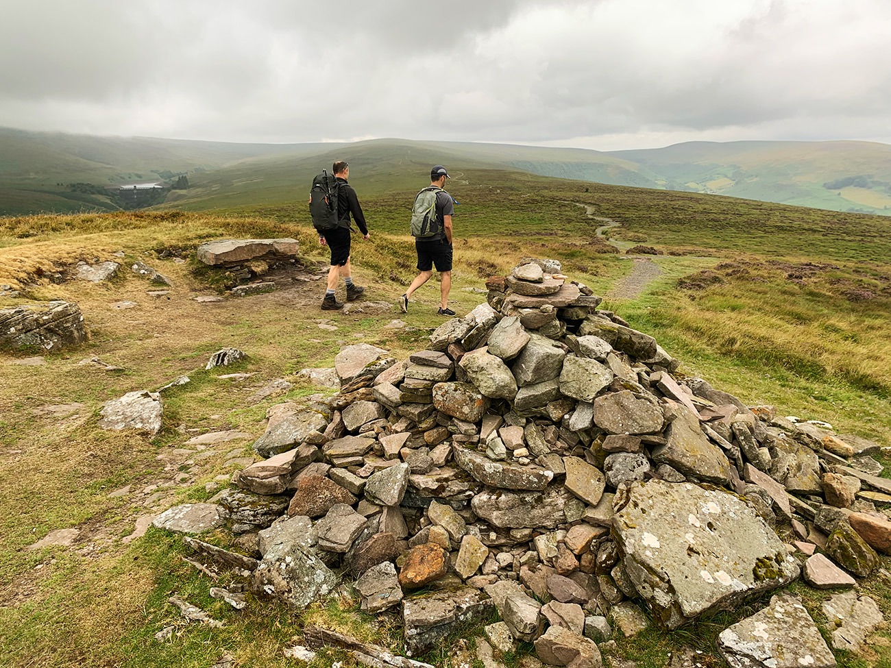 The walk continues northwest to the grassy top of Pen y Manllwyn and onto the broad, peaty dome of Waun Fach. While the summit itself is modest and unmarked, the panoramic views stretch across to Pen y Fan, the Central Beacons, and east toward the Shropshire Hills.